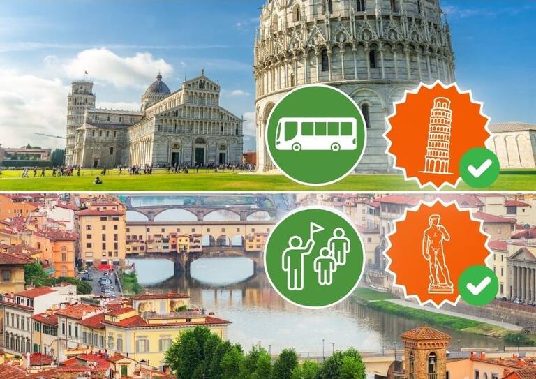 ¡Visita Florencia y Pisa en un solo día! ¡A bordo de nuestro autobús, acompañado por nuestro acompañante experto, tendrá la oportunidad de llegar y visitar estas dos maravillosas ciudades!